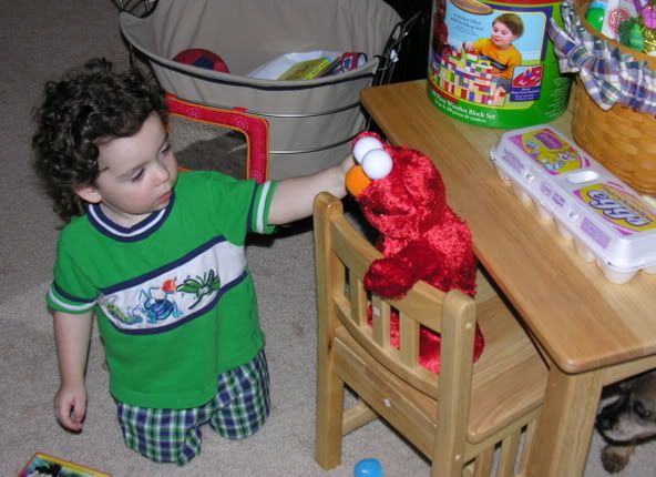 He wasn't quite sure of Elmo when he first saw him, but he loves him now.