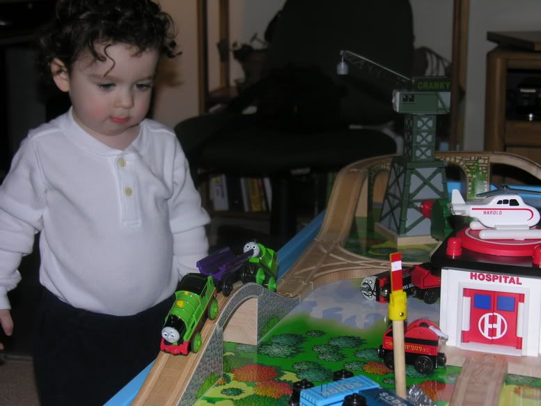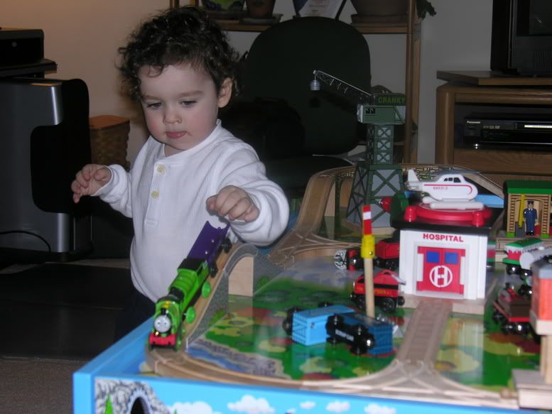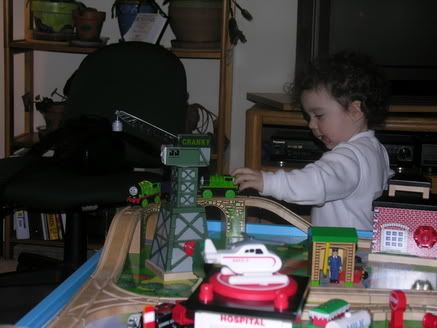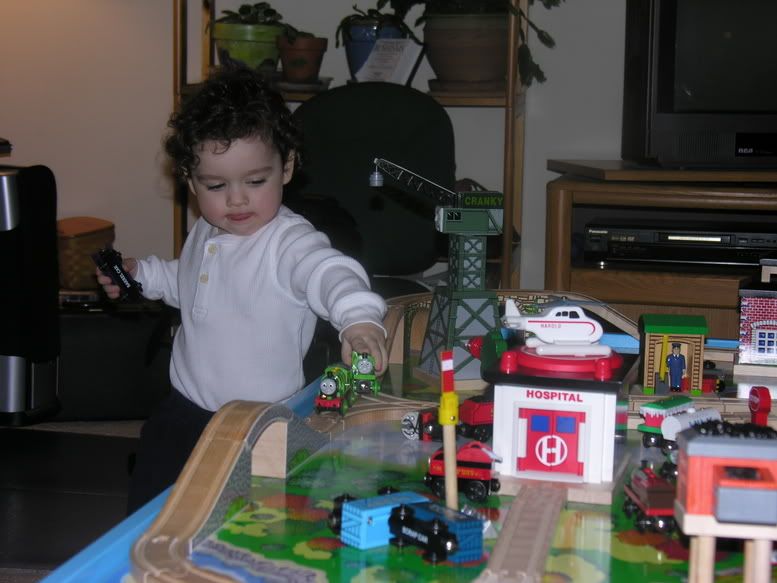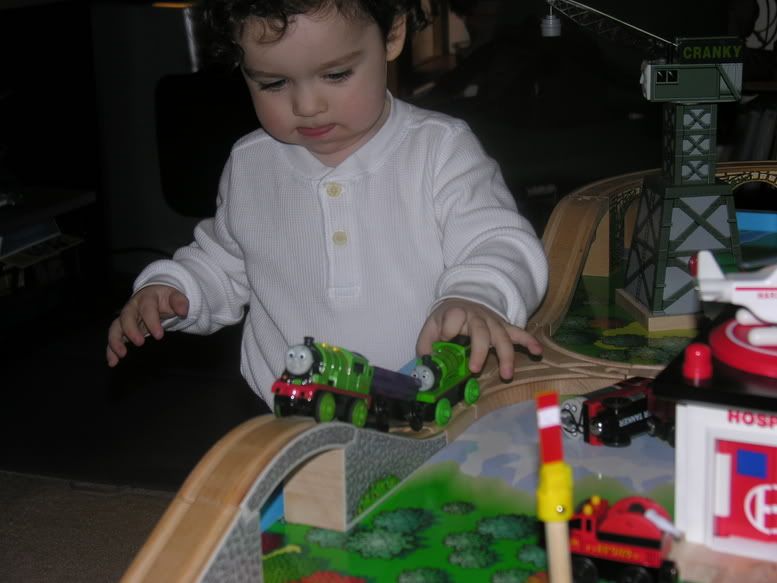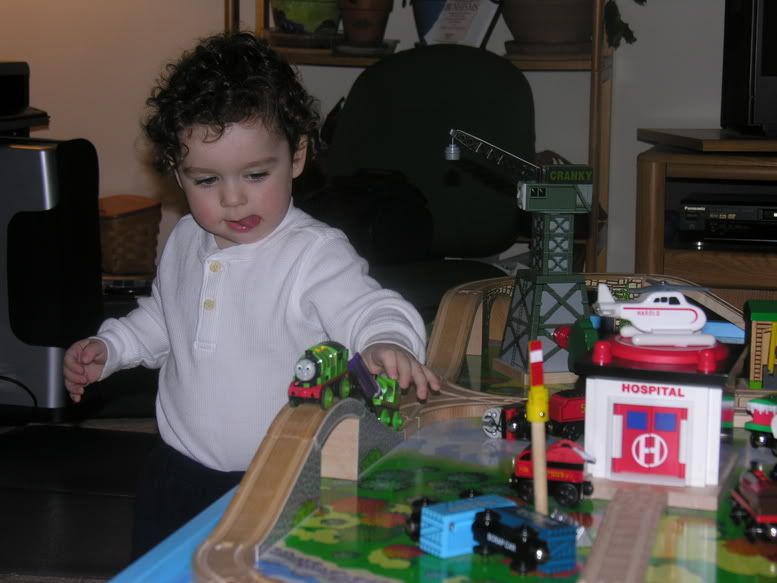 Abbie and John Campbell have played with his train table so much since Santa brought it. We finally got a layout that is toddler-friendly. John Campbell loves making trains and feeding them around the track. He is so engaged while playing, so serious like his daddy. And take a look at that tongue hanging out in serious concentration.